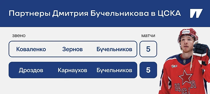 После того самого разгрома от «Локомотива» Бучельникова поставили в звено к Павлу Карнаухову и Ивану Дроздову. Формально это теперь ударная тройка ЦСКА, хотя сочетание Коваленко и Спронга выглядит не хуже.