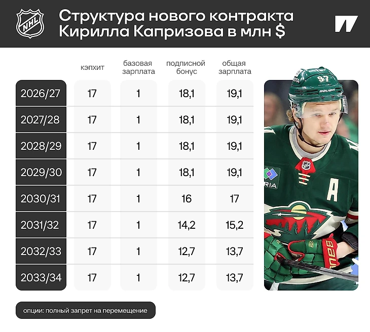 Ах да: конечно, весь срок действия контракта у Капризова действует полный запрет на перемещение – ни обменять, ни отправить в низшие лиги, ни поместить на драфт отказов россиянина без его одобрения нельзя.