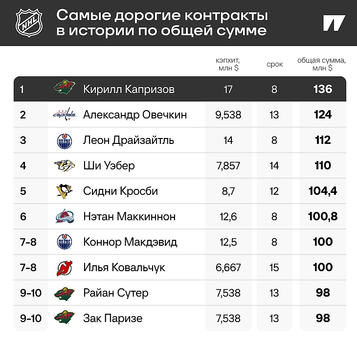 Безусловно, этот контракт будут сравнивать с другими. Например, Леон Драйзайтль, который до 1 июля 2026-го будет самым высокооплачиваемым игроком лиги, получил 14 млн в год – он шесть раз выбивал 100+ очков за сезон, четыре раза – 50+ шайб, дважды играл в финале и вообще игрок примерно топ-5 в НХЛ. Митч Марнер, более тонкий и мастеровитый нападающий, к тому же с великолепной двусторонней игрой, с этого лета получает 12 млн в год. У обоих контракты на 8 лет – как и у Капризова. Неужели они настолько слабее или менее ценны?