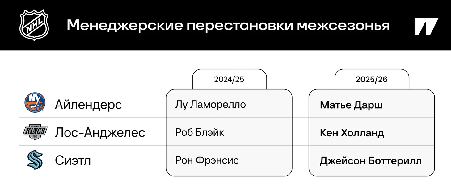 Новым генменеджером назначили Матье Дарша, который до этого помогал Жюльену Брисбуа в «Тампе». Дарш провел исторический для «Айлендерс» драфт-2025, где клуб под первым номером выбрал защитника Мэттью Шефера. В день драфта Дарш сделал первый громкий обмен: отправил в «Монреаль» Ноа Добсона и получил Эмиля Хейнемана вместе с двумя пиками первого раунда.