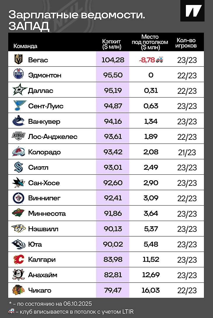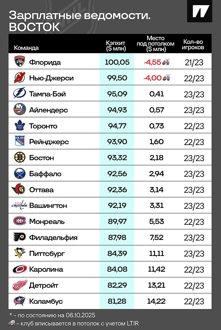 ● Еще есть пространство под потолком у «Сан-Хосе». «Акулы» продолжают перестройку, а в дедлайн наверняка будут одними из самых активных дельцов. В команде много хоккеистов на истекающих контрактах, и руководство явно попробует их выгодно продать. Именно с этой целью клуб нагрузил платежку контрактами Кэри Прайса и Райана Эллиса (оба из-за травм фактически завязали с хоккеем) – чтобы в течение сезона проводить обмены и не выходить за пол зарплат.