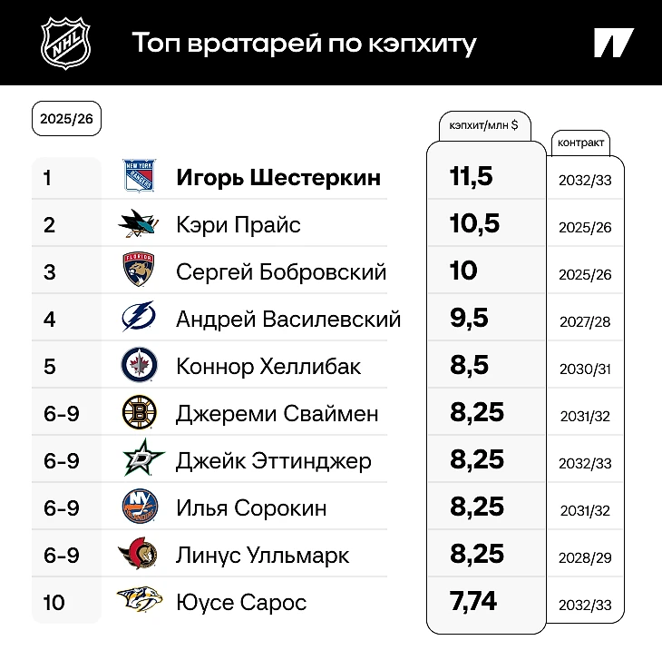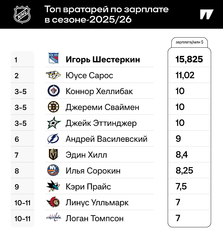 ● Элиас Петтерссон, Эрик Карлссон и Вильям Нюландер также сохранили места в топе, но с последними двоими поравнялся одноклубник Панарина и новый самый дорогой вратарь в истории хоккея – Игорь Шестеркин. В начале прошлой регулярки голкипер подписал восьмилетний контракт на $92 млн и опередил Кэри Прайса, единственного на тот момент вратаря с зарплатой больше 10 млн в год. Сезон для Игоря вышел неровным, но штормило всю команду – «Рейнджерс» даже не попали в плей-офф. Теперь россиянину нужно доказывать, что ему неспроста выписали такой чек.