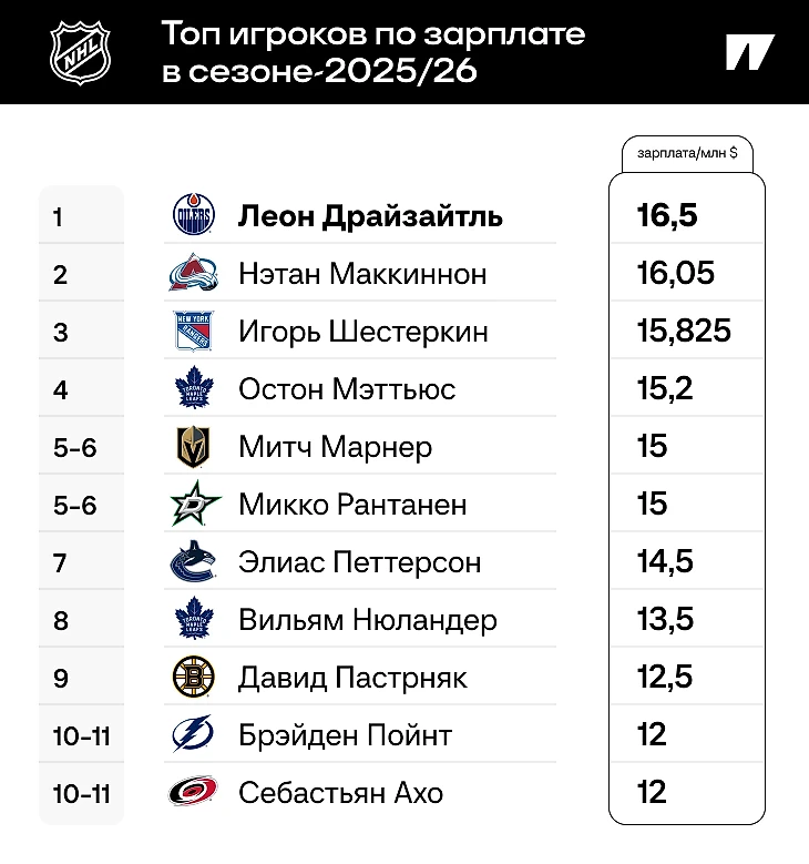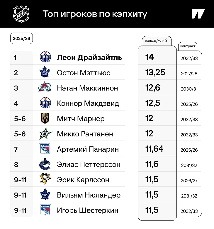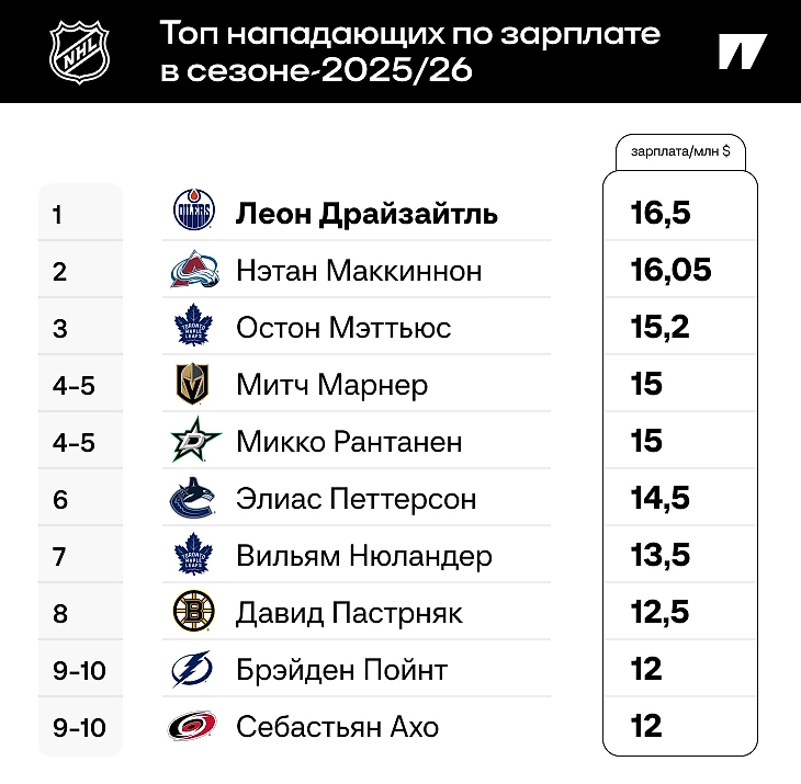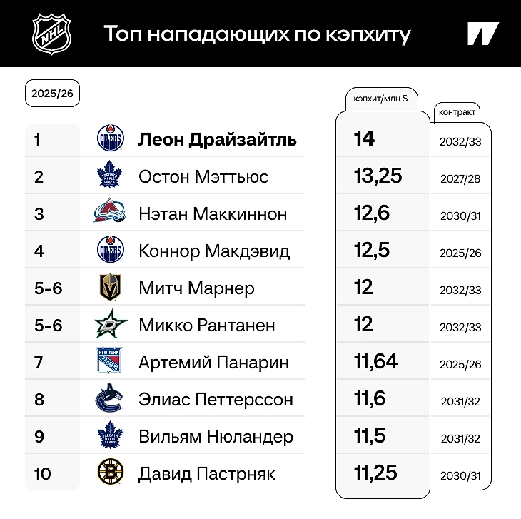 Конечно, рейтинг реальных зарплат на ближайший сезон выглядит иначе: большинство хоккеистов предпочитает загружать деньгами начало контракта, а не просто получать одни и те же суммы весь срок соглашения. Вот топ-10 (точнее, топ-11) зарплат конкретно на сезон-2025/26: