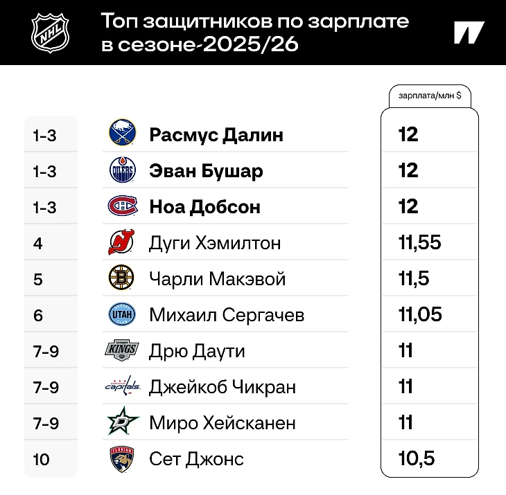 ● С седьмого по девятое место расположились еще три новичка рейтинга: новый самый дорогой защитник «Вашингтона» Джейкоб Чикран, лучший пакмувер «Далласа» Миро Хейсканен и, внезапно, Дрю Даути, чья номинальная зарплата за ближайший сезон совпадает с реальной – 11 млн.
