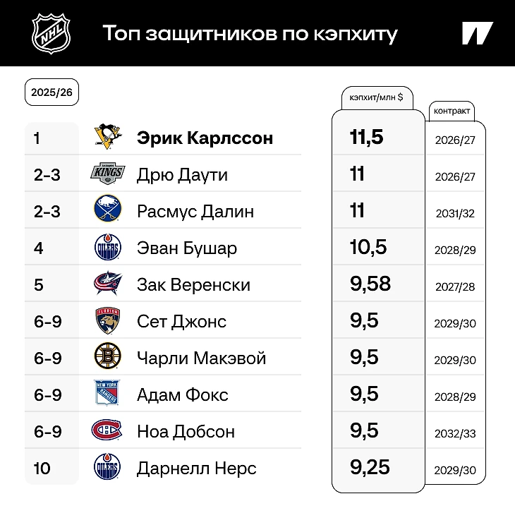 ● Дальнейший топ без изменений по сравнению с прошлым годом – в отличие от рейтинга реальных зарплат. Лидер – Карлссон, за ним вровень Дрю Даути и Расмус Далин с 11 млн. Через два года контракты шведского и канадского ветеранов истекут, но Далина это лидером не сделает: вряд ли лучший защитник НХЛ Макар, чье соглашение также действует до лета 2027-го, получит меньше 11 млн.