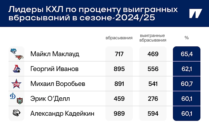 Неудивительно, что и в КХЛ Маклауд стал лидером по этому показателю. В регулярке-2024/25 он выиграл 65,4% вбрасываний. Георгий Иванов из «Локомотива» занял второе место, но отстал от Майкла аж на три процента.