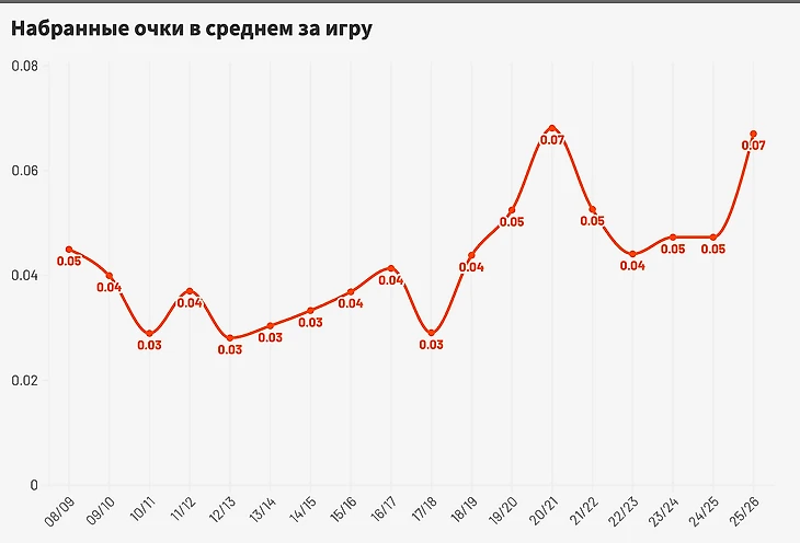 В нынешнем сезоне результативность вратарей держится на одном из самых высоких уровней: ≈0,07 очка за игру (на уровне 2020/21). При этом в текущем сезоне вратарских голов пока не было, но вот передач уже 12, причем у Артема Загидулина из Спартака целых 2.