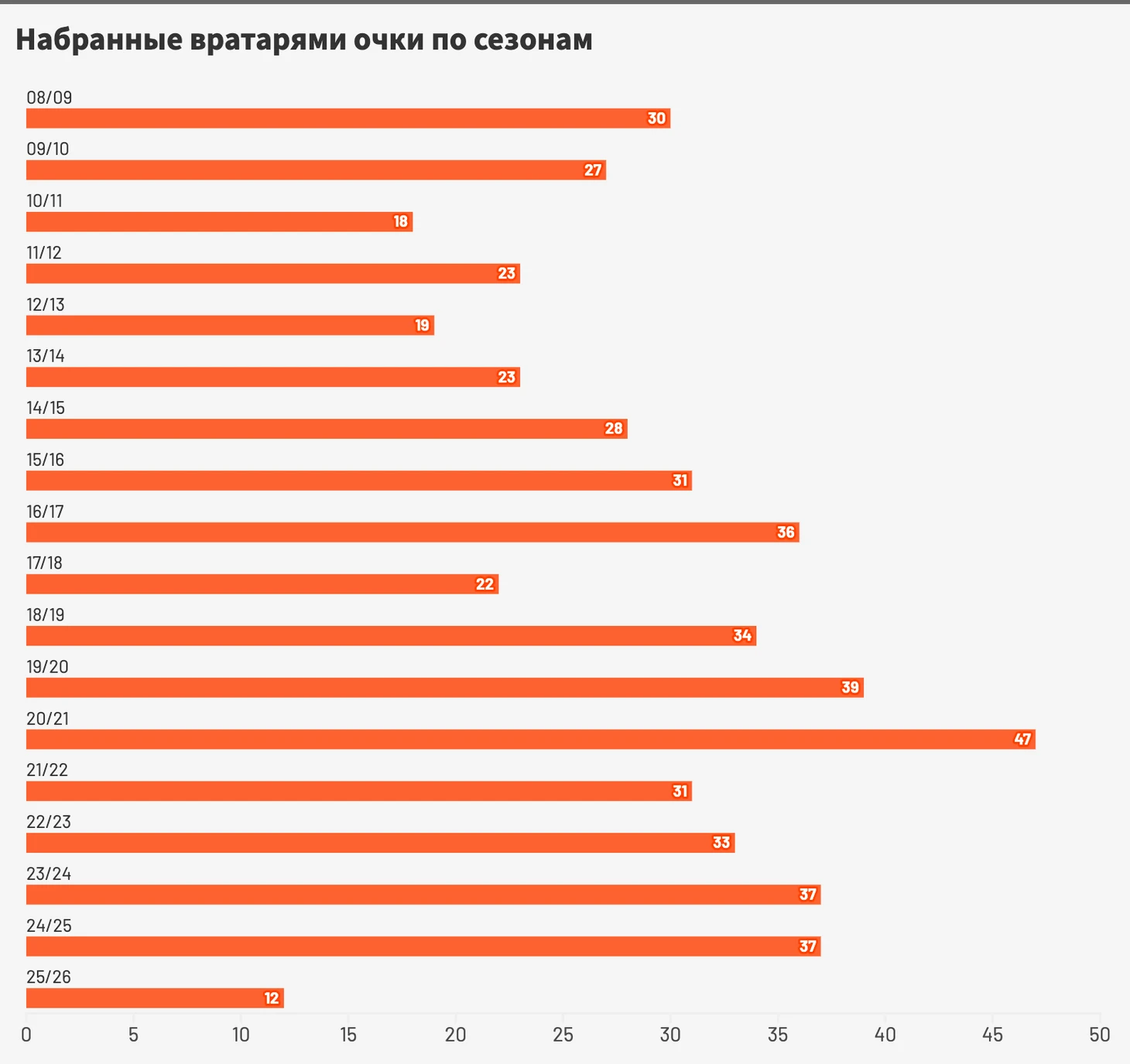Из 395 вратарей, сыгравших в лиге хотя бы один матч, 174 хотя бы раз набирали очки — это 44,2%.
