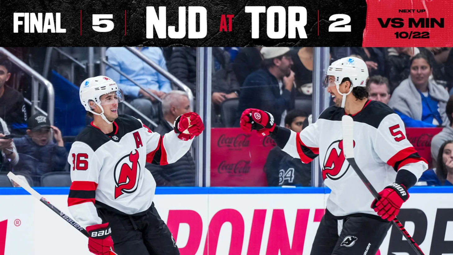 «Торонто Мэйпл Ливс»-»Нью-Джерси Дэвилз» 2:5. Джек Хьюз забросил 3 шайбы, Йеспер Братт отдал 3 результативные передачи, Арсений Грицюк отдал результативную передачу, Джек Аллен отразил 23 броска. У хозяев Джон Таварес набрал 2 очка (1+1), Вильям Нюландер отдал 2 результативные передачи. В 3 периоде Симон Бенуа подрался с Брайаном Халоненом.