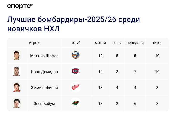 На всякий случай напомним: парню только 18 лет, его выбрали под первым номером на последнем драфте, но он очень быстро освоился в НХЛ. Вот, к примеру, таблица бомбардиров-новичков сезона. А ведь он защитник (как и Байум, кстати).