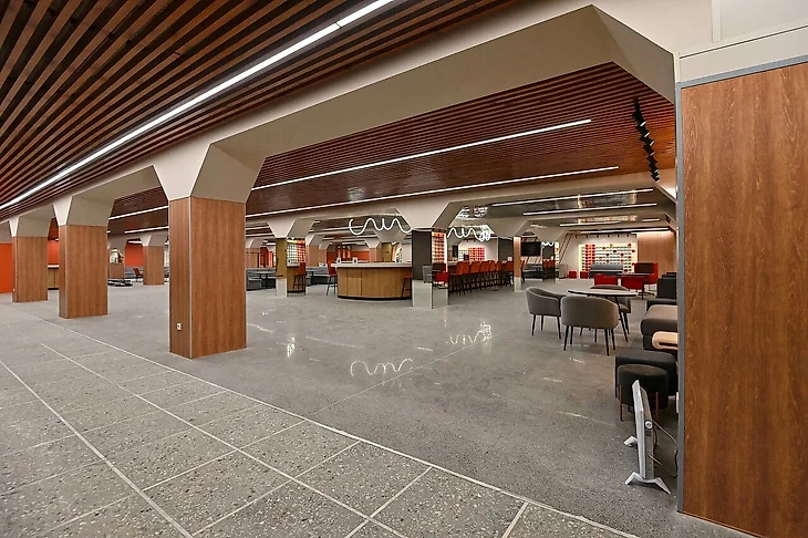 Просторное фойе, отделанное с использованием современных материалов. Лампы и потолок напоминают коридоры G-Drive Арены, а дух старого СКК заключён в фресках и картинах на стенах, которые рабочие бережно сохраняют, а местами и восстанавливают.