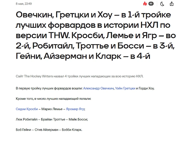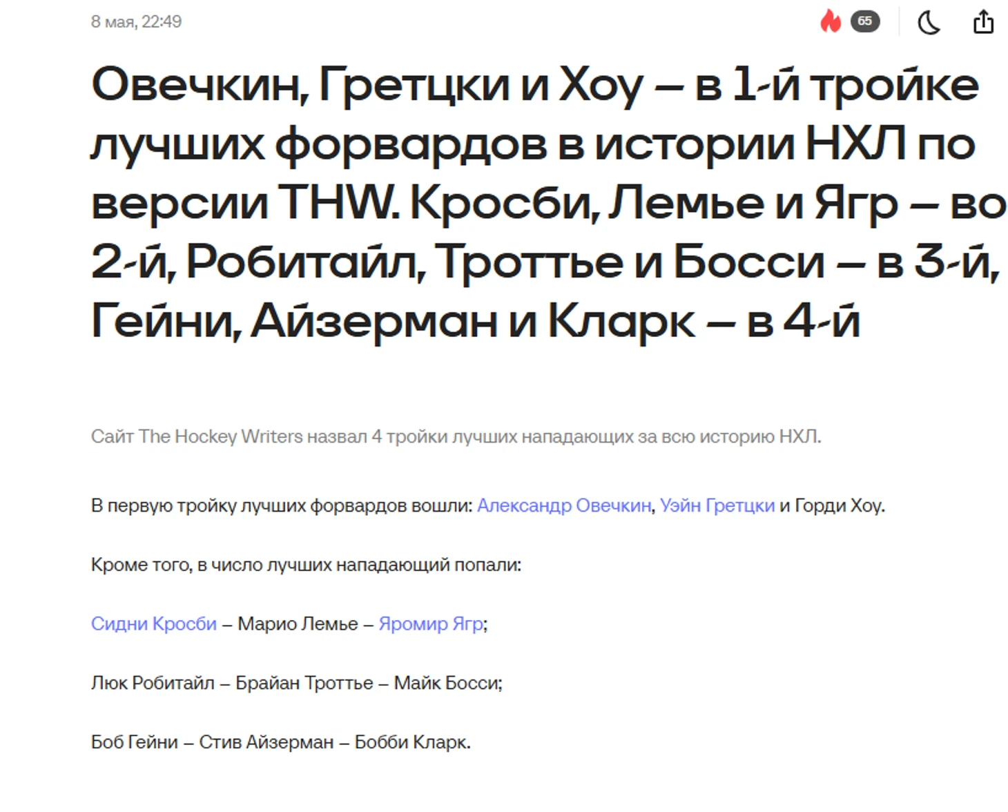 Прошло 7 лет, и я впервые за это время наткнулся на вариант символического ударного звена от заокеанского ресурса. Сайт The Hockey Writers назвал 4 тройки лучших нападающих за всю историю НХЛ. В первую тройку вошли АлександрОвечкин, Уэйн Гретцки и Горди Хоу. Новость на спортсе вышла 8 мая этого года.