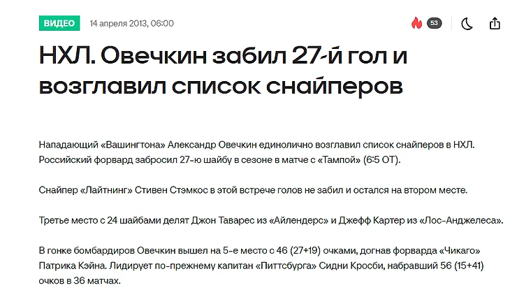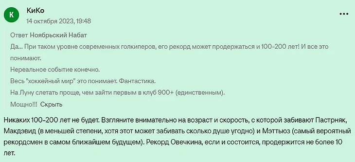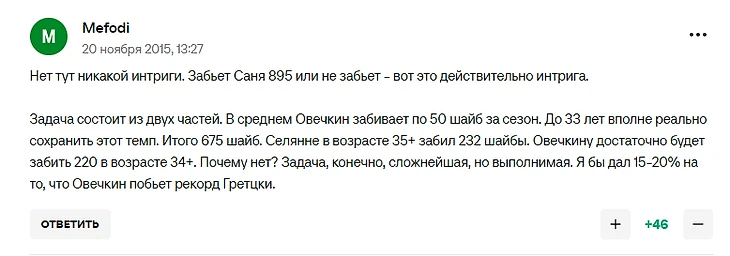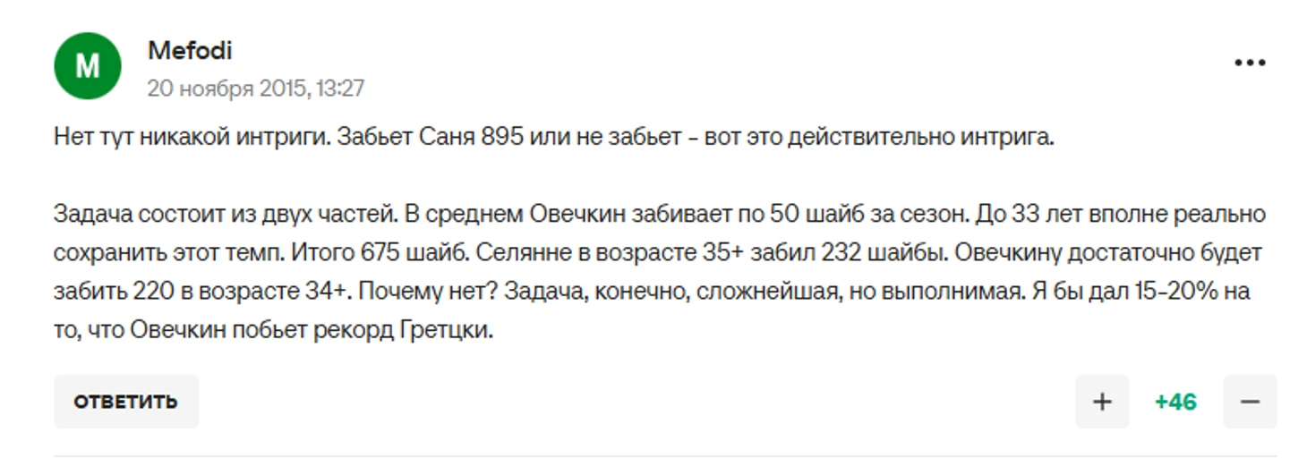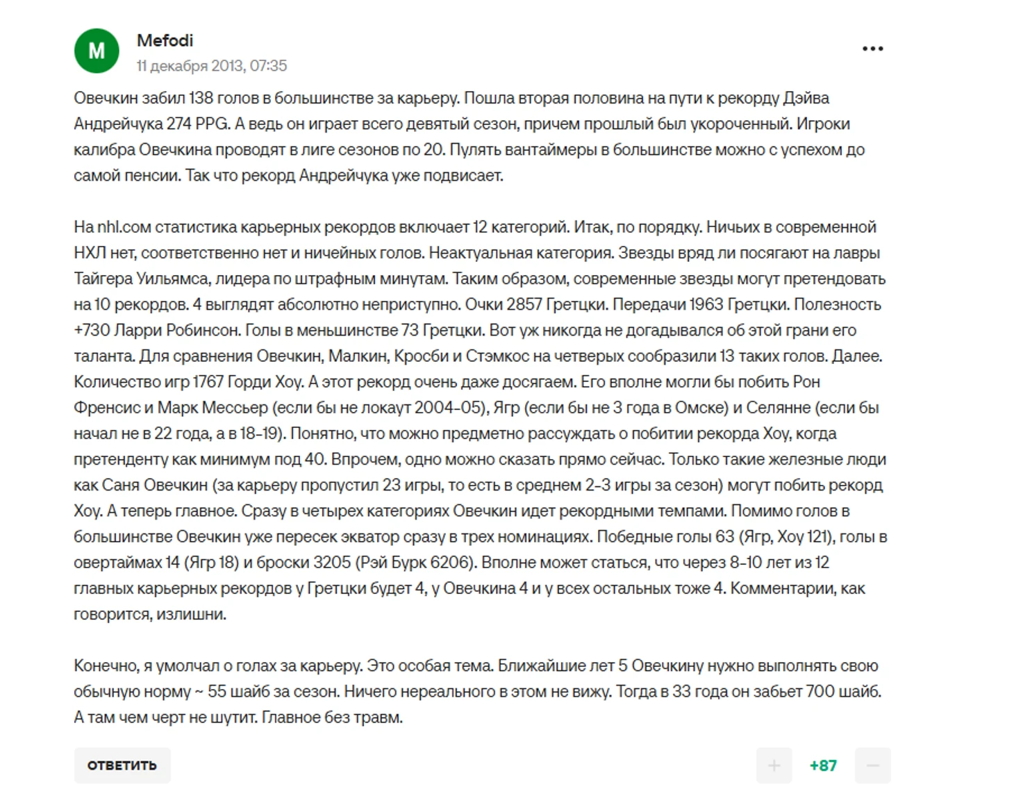Прошу обратить внимание на последний абзац, насколько аккуратно, осторожно, взвешенно я делаю свой прогноз относительно атаки 28-летнего в тот момент Овечкина на главный рекорд лиги. А дело в том, что я и тогда 12 лет назад собирался отвечать за сказанные мною слова.