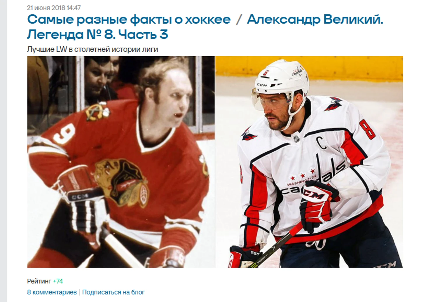 Идём дальше. Во время триумфальной кубковой кампании 2018 г. и последующего всеобщего бурного ликования я никоим образом не отметился на спортсе. Я выдержал гроссмейстерскую паузу и спустя 2 недели провёл сравнение Александра Овечкина и Бобби Халла.