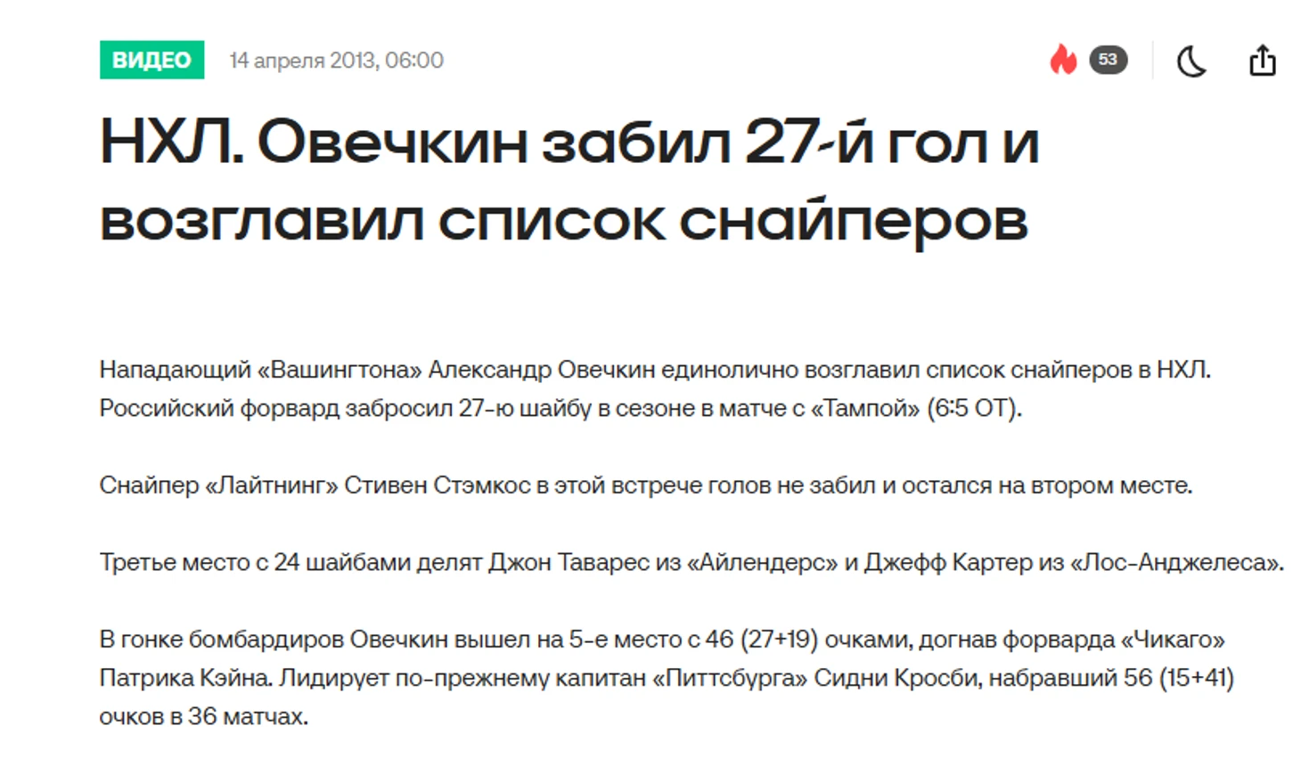 Совершенно случайно наткнулся на спортсовскую ветку почти 12-летней давности, посвящённую покеру Овечкина в ворота Тампы. Любопытный выдался матч! Вашингтон отыграл отставание в три шайбы и вырвал-таки победу. Саня возглавил лютый камбэк и сравнял счёт на последней минуте при снятом вратаре. Кстати, одну из шайб он забросил в своём нынешнем стиле, сразу после выигранного вбрасывания.