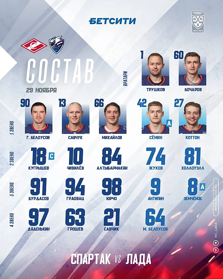 29 ноября, 13:06 1 мин. Состав спартаковцев на игру против «Лады»Коля СтрогоновАвтор61 подписатьсяВ воротах сегодня дебютировает Александр Георгиев. Состав наших соперников:Спартак