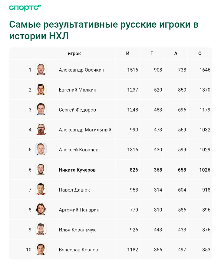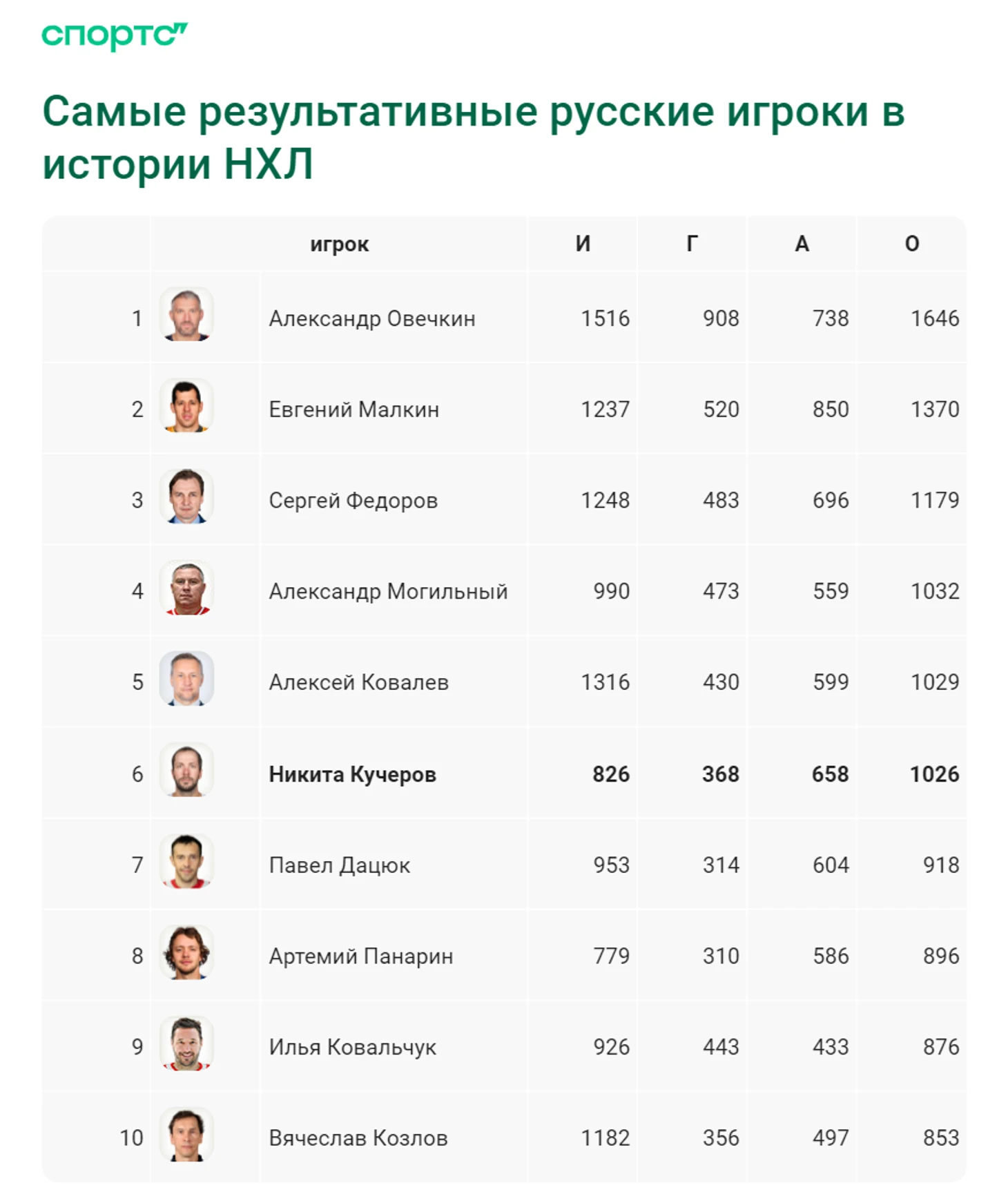 Пока Кучеров приближается к тому, чтобы в ближайших играх выйти на четвертое место среди самых результативных русских игроков в истории НХЛ. Ноябрьский рывок приблизил Кучерова вплотную к Алексею Ковалеву, а там и до Александра Могильного недалеко.