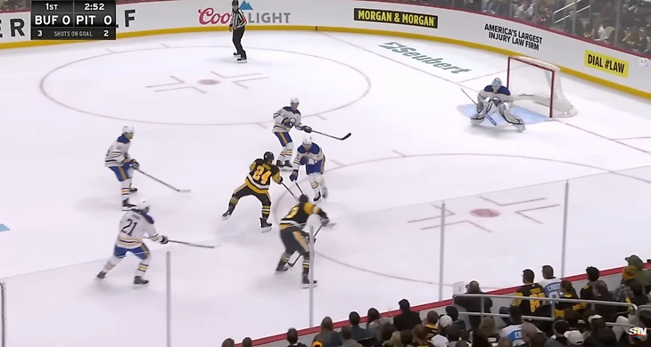 «Баффало Сейбрс». Матч начался с преимуществом «Пенс». Хозяева больше держали шайбу, чаще появлялись с ней в зоне соперника, правда, за весь первый период команды общими усилиями нанесли всего 9 бросков в створ ворот (5—4). Зато один из бросков «Питтсбурга» в исполнении Мэтта Дамбы завершился взятием ворот «Сейбрс». Для Дамбы этот гол стал дебютным в составе «Пенс», с чем мы его и поздравляем.