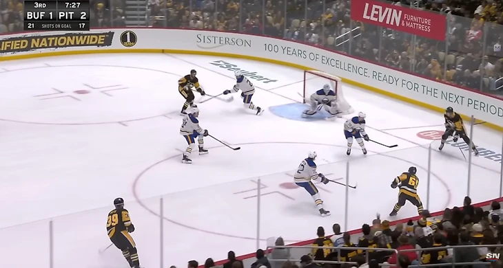 К счастью, нынешний «Питтсбург» умеет не только раздавать преимущество соперникам, но отыгрываться в трудных ситуациях сам. Не откладывая дело в долгий ящик, Раст сократил разрыв в счёте уже 13-й секунде третьего периода. Всё-таки 2:3 — это уже было слегка попроще. Кстати, шайба Раста очень напомнила шайбу Дамбы в ворота «Баффало» — тоже с кистей над левым плечом вратаря.