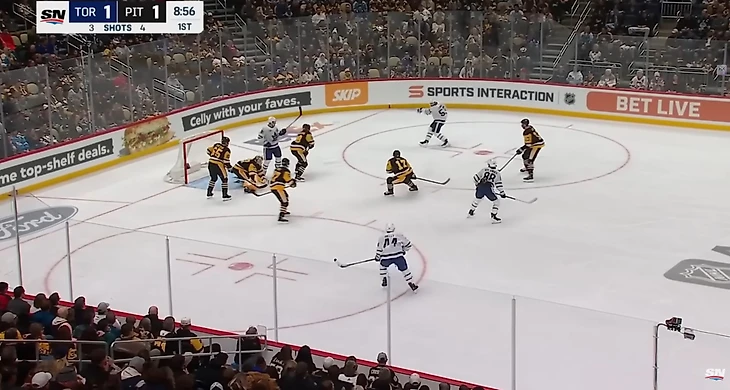 Первые 9 бросков принесли 4:1 в пользу «Торонто». Между первым и вторым голами гостей затесался красивый гол с лёта Бена Киндела в большинстве. Похоже, Бен — чуть ли не единственный игрок «Пенс», на которого магия «Торонто» действует в меньшей степени. Из своих 6 шайб три он забросил именно «Листьям».
