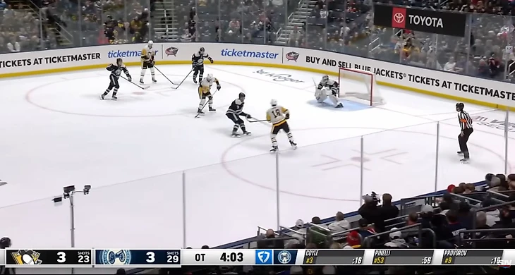 Дополнительный период в кои-то веки принёс болельщикам «Пингвинов» не разочарование, а радость. «Виной» тому пас Малкина ногой из борьбы с двумя соперниками у борта на Летанга, который вместе с подключившимся Новаком разыграл «двоечку». Крис не разучился забрасывать с трёх метров, что он в этом эпизоде и доказал. Трудовая победа в гостях и очередные два очка в копилку.