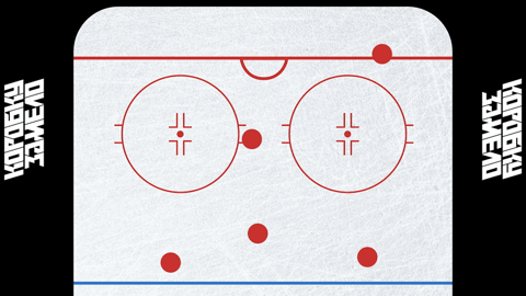 У вас база на чужом среднем пятаке (пространство между кругами вбрасывания в зоне соперника – Спортс’’). Один побежал в угол – и если заставил человека сделать передачу за ворота, то бежит обратно на пятак, а партнер, который был на пятаке, бежит на того, кто с шайбой. Если соперник возвращает обратно, то все заново.