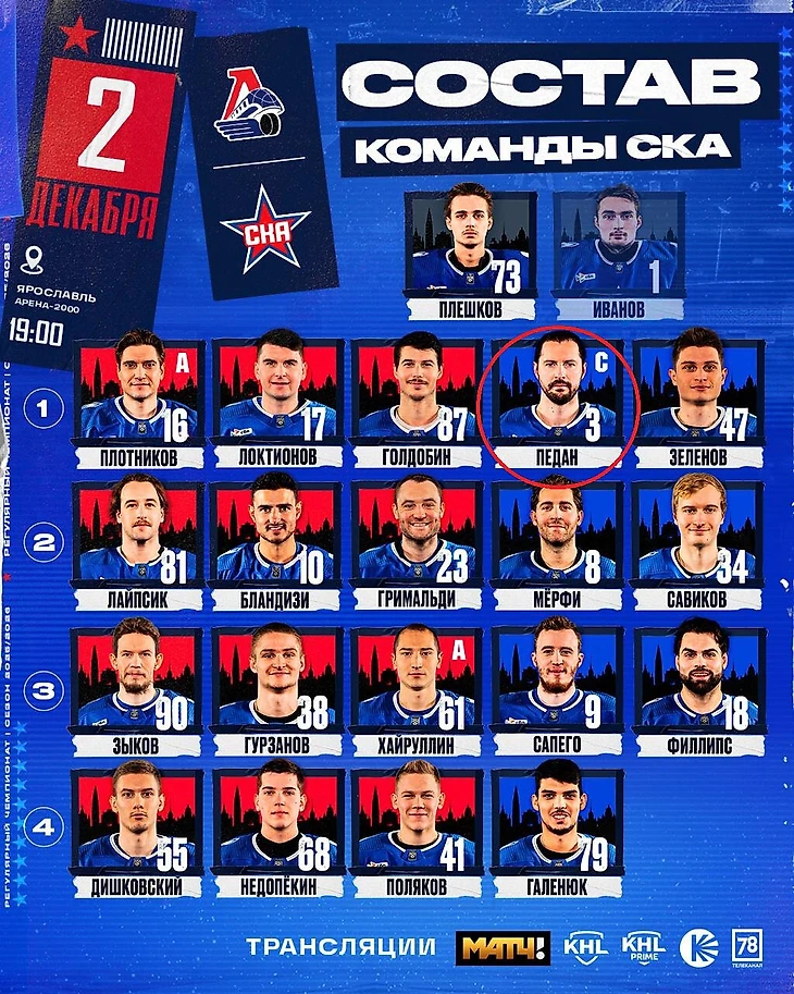 В соцсетях СКА опубликована заявка команды на игру в Ярославле. Там капитаном указан Андрей Педан, а Сергей Плотников – один из его ассистентов.