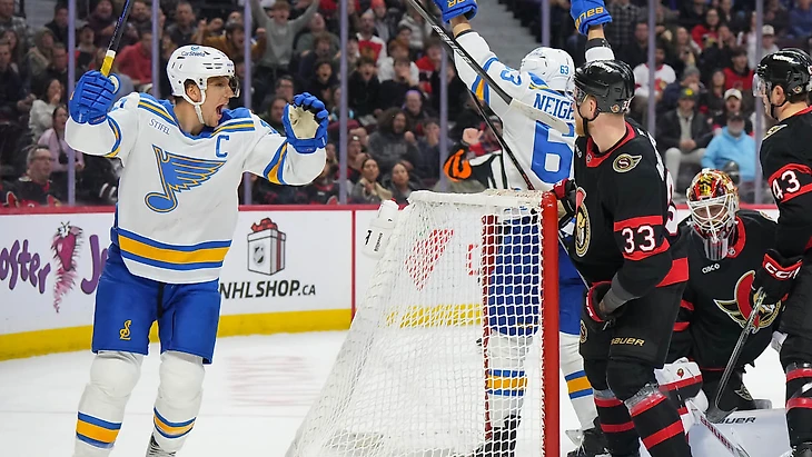 «Оттава Сенаторз»-»Сент-Луис Блюз» 1:2. Джейк Нейборс забросил 2 шайбы, Павел Бучневич отдал результативную передачу, Джоэль Хофер отразил 41 бросок.