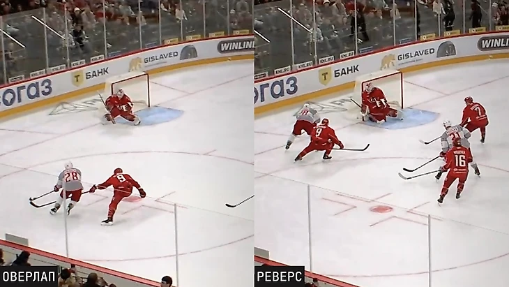 В другой ситуации, леворукому игроку (28) ставит клюшку встык защитник (9), и в отсутствие прямого броска вратарь в правильном тайминге переходит из «оверлапа» в «реверс» (прижимается к штанге, опускаясь на один щиток).