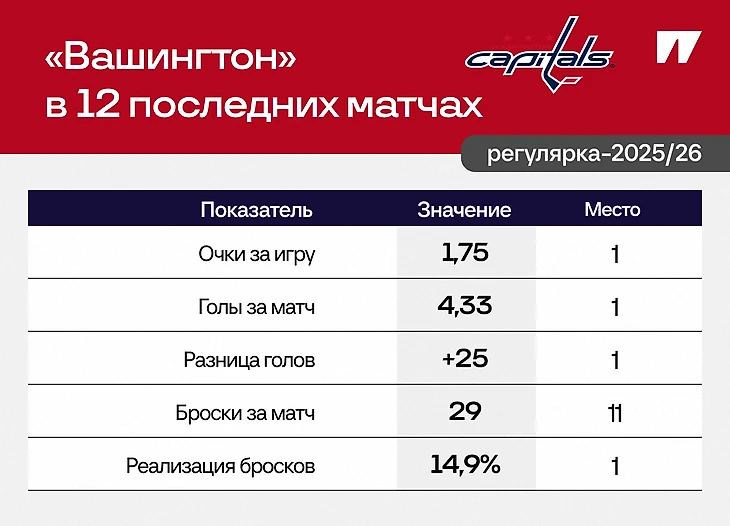 Взлет команды и рост результативности Овечкина напрямую связаны: когда капитан забивает, «Кэпс» побеждают. В этом сезоне правило сработало в 10 случаях из 11 при одной неудаче по буллитам. В дни, когда Александр молчал, у команды 7 побед и 11 поражений.