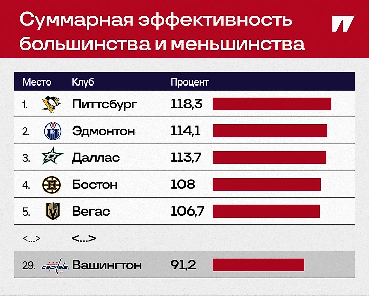 Месяц назад большинство «Кэпиталс» стояло на 23-м месте в лиге, а меньшинство – на 27-м. После серии удачных матчей и взлета в турнирной таблице показатели ничуть не улучшились. Теперь это 25-я и 27-я строчки – то есть команда нередко побеждает вопреки спецбригадам.
