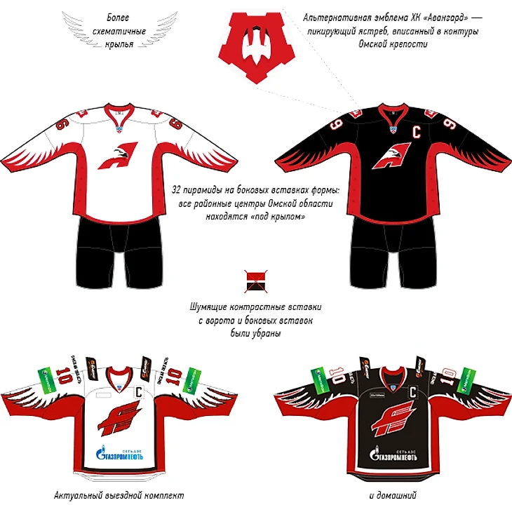 Надеюсь когда-нибудь увидеть концепт «Авангарда». Какое-то время я однозначно считал, что у омичей лучшая форма в нашем чемпионате и приличное лого, но время не стоит на месте, и мне кажется, пришло время двигаться далее, пора чуть освежить... Начать нужно как минимум с того, чтобы убрать полукруг с надписью «Омский Авангард» (и на выездной форме чёрное пятно из-под него). Кроме того, что-то нужно делать с литерой А. С одной стороны, ястреб пикирует вниз — это понятно, как в природе; с другой стороны, и сам клуб сейчас не на подъёме (комментарий был написан в январе 2012. — SI), и сама эмблема вниз «тянет». Хотелось бы что-то стремящиеся в верном направлении.. глядишь, и дела у команды пойдут лучше. Да шрифт сделать уникальным, может быть даже с элементами когтей, клюва и перьев — хотя, наверное, это слишком. [...] В общем, когда нибудь хотелось бы увидеть что-то новое в форме, надеюсь, вы когда-нибудь и доберетесь до моих любимцев.