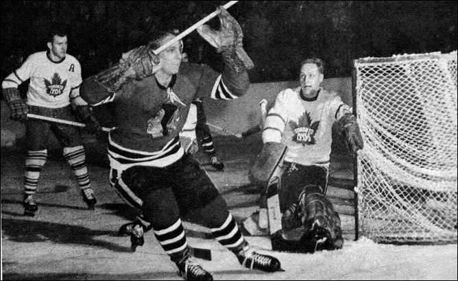 Освободившись от, так сказать, сковывавших его пут, Халл смог переключить свое внимание с зубодробительных обязанностей оборонца на много более приятное дело снайпера. Он буквально расцвел в новой роли. Подхватив шайбу концом клюшки, два-три раза шевельнув коньками, он уже летел по льду, являя собой воплощенный поток энергии, наконец нашедшей себе выход. Мгновение спустя он оказывался на противоположной половине поля, отмеряя коньками доли секунды по льду, а потом выпаливал шайбу с расстояния шестидесяти футов, забрасывая ее невесть откуда в ворота. Его пушечные броски, которых боялись все в НХЛ, описывал такой авторитет, как игравший за Монреаль Бум-бум Джеффрион, называвший их «самыми сильными на моей памяти».