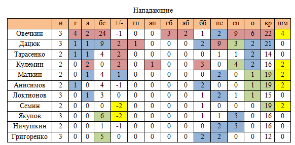 и – игры, г – голы, а – ассисты, бс – броски в створ, гп – победные голы, ап – победные ассисты, гб – голы в большинстве, аб – ассисты в большинстве, бб – заблокированные броски, пе – перехваты, сп – силовые приемы, о – очки, вр – среднее время на льду в матче, шм – штрафные минуты.