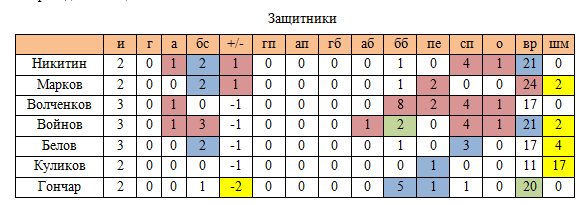 Пока, более менее, на уровне играют Никитин и Марков. Оба они имеют показатель полезности +1 и проводят более 20 минут на площадке. Волченков в своем стиле принимает кучу шайб на себя. В 3 играх эта куча уже выросла до 8, кроме этого у него 4 силовых приема и 2 перехвата. В принципе Антон делает то, что лучше всего умеет. Белов пока осваивается в «Эдмонтоне», поэтому сложно как-то оценить его игру. Гончар не смог сходу стать лидером «Далласа», он хотя и проводит по 20 минут за встречу, но всего 1 бросок и показатель полезности -2 говорят нам о том, что не в лучших кондициях на данный момент находится Сергей, хотя 5 заблокированных бросков выглядят вполне неплохо. Свой уровень демонстрирует Войнов. Пока из всех российских защитников он больше всех нанес бросков по воротам (3), отметился голевой передачей (в большинстве), а также 4 раза хитанул и принял на себя 2 шайбы. Ну и в конце, Куликов пусть еще не отметился какой-либо значимой статистикой, зато успел подраться.