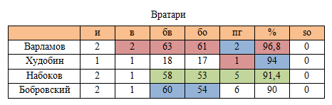 В сборной России вряд ли будет проблема с вратарями, разве что, сложно будет сделать выбор. На старте сезона лучше других выглядит Варламов. Он провел 2 матча, они оба завершились победой его команды. В первом против «Анахайма» он отразил 35 бросков из 36, а во втором против «Нешвилла» - 26 из 27. Статистику остальных наших вратарей можете посмотреть в таблице выше.