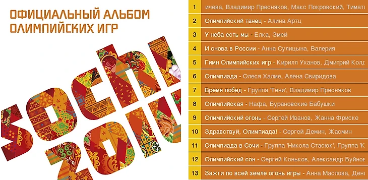 Стоит отметить, что на этом музыкальная часть не заканчивается – к Играм в Сочи был даже выпущен Официальный альбом Олимпийских игр. Помимо двух вышеупомянутых песен здесь еще 11 не самых известных композиций, каждая из которых у вас вряд ли будет ассоциироваться с ощущениями во время просмотра февральских соревнований. Более того, я даже не знаю всех исполнителей с этого альбома, что во многом является диагнозом для их нынешней популярности.