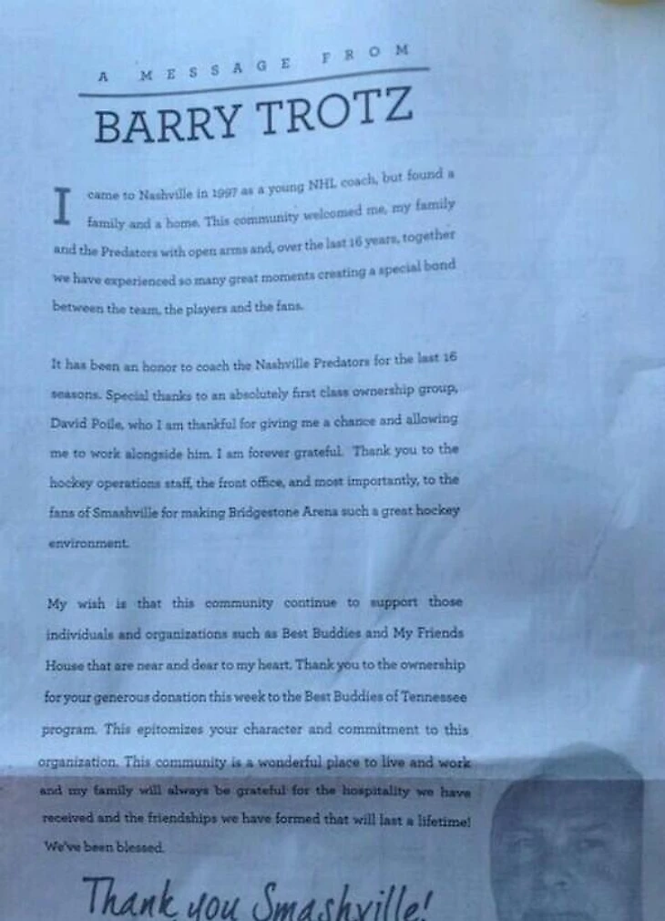 P. S. В воскресенье Троц попрощался с болельщиками «Нэшвилла», выкупив для своего обращения полосу в газете The Tennessean.
