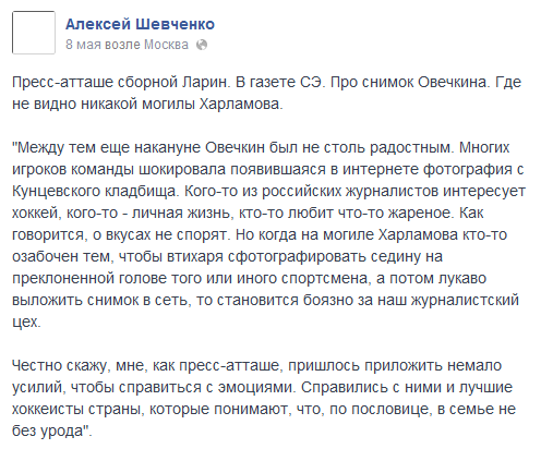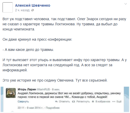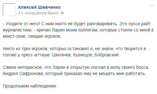 Понятно, что Алексей Шевченко ненавидит Ларина, равно как и Ларин ненавидит Шевченко. И тем не менее, очевидно, что в вопросах своей некомпетентности Игорь Ларин (как журналист и как пресс-атташе) не просто достиг дна, но пробил скважину, устремился к ядру Земли, пробил в итоге земной шар насквозь и успешно вышел на околоземную орбиту.