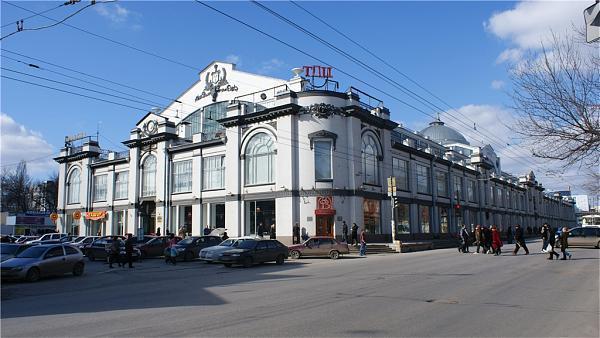 Прямоугольное в плане, кирпичное, оштукатуренное здание стоит по красной линии застройки ул.Чапаева и является градостроительной доминантой площади Кирова (бывш.Митрофаньевской), определяя ее масштаб и организуя пространство. В композиционно-пространственной структуре сооружения выделяется объем трехсветного торгового зала рынка с куполом в центре. По периметру вокруг зала рынка в два этажа расположены торговые помещения универмага. Конструкция здания каркасная. Главный объем, полный воздуха и света, выстроен с использованием новых для начала XX века конструкций - стальных ферм разного очертания - двухскатных и полукруглых, первые использовались для перекрытия зала, вторые участвовали в устройстве ребристого купола, расположенного в центре на пересечении продольной и поперечной осей. Оси закреплены 4-мя главными входами в рынок, а на их пересечении, под куполом, был сделан круглый фонтан со скульптурной группой из двух колхозниц. Пространство рынка освещалось естественным светом при помощи высокого треугольного фонаря, венчающего кровлю и крупных прямоугольных окон в верхней части стон рынка высотой почти в целый этаж. Кровля здания двухскатная, крытая жестью, в интерьере видна деревянная обшивка потолка. Здание имеет 4 главных входа в рынок и 8 в универмаг, фасады равноценные.