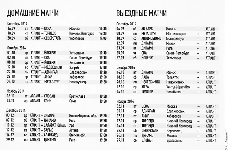 Да, эта та же самая таблица. Высота осталась неизменной, но появились чистота и простор — в освободившиеся места дизайнер может поставить сочные иллюстрации. Таблица стала яснее и проще для восприятия информации. Локация исчезла, так как в расписании она, на мой взгляд, лишняя. А вот что имеет смысл указать дополнительно, так это принципиальных соперников и московское время начала выездных матчей (с вынесенным в столбец обозначением МСК). Разумеется, в общем оглавлении таблицы нужно выделить, какой именно идёт сезон.