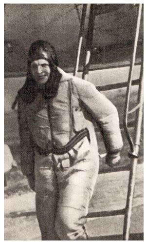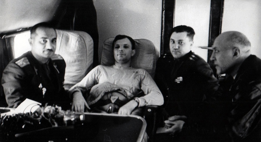 Юрий Гагарин после приземления спускаемого аппарата космического корабля. Сразу после первого обследования.