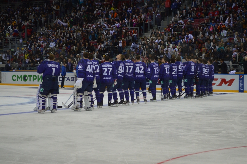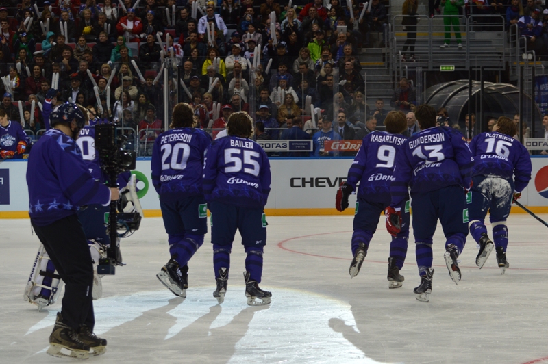 Пусть я стоял спиной к зрителям, но было ощущение, что во время стартового вбрасывания с улыбками на лицах были абсолютно все болельщики. Матч стартовал очень резво, к третьей минуте счет был уже 2:1 в пользу Запада. Вторую шайбу в ворота Востока отправил Ник Бэйлен! Динамовец привычно проводил львиную долю времени на площадке, казалось, что даже в Матче звезд Ник доберется до своего привычного показателя в 27 минут.