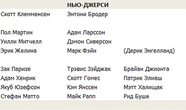 Еще вчера в воротах виртуальной команды был бы Мартин Бродер, но ночью он завершил карьеру, и его место займет сын Энтони, какой бы пугающей не была его статистика в лиге Квебека. Топ-6 нападения напомнит о славных 2000-х, на третье и четвертое звенья лучше не смотрите. Эта команда проиграла бы даже сегодняшним «Девилс».