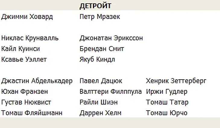 Нет, мы не скопировали в табличку нынешний состав «Детройта» за исключением второго звена. Все эти игроки были выбраны «Ред Уингс» на драфте. Почти 90% основы команды в сезоне-2014/15. Впечатляющая работа Кена Холланда и группы скаутов. Пиков в топ-10 драфта у «Детройта» не было с 1991 года, а на подходе Энтони Манта и Дилан Ларкин.