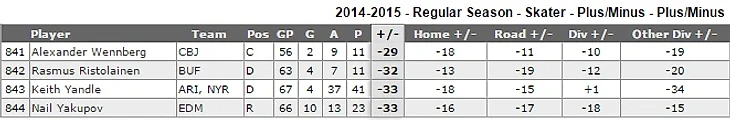 Недавний матч чемпионата НХЛ между «Детройтом» и «Эдмонтоном» был примечателен не только дебютом арбитра Евгения Ромасько. Форвард «Ойлерс» Наиль Якупов через 51 секунду после десятого гола в сезоне оказался на площадке в момент, когда забрасывалась четвертая шайба «Ред Уингс». Она принесла ему 33-й «минус» в играх регулярке-2014/15 и отправила на 844-е место по показателю полезности. «Минус 33» и у новичка «Рейнджерс» Кита Йэндла, где-то рядом юниор «Баффало» Расмус Ристолайнен («минус 32»). Следующий по «бесполезности» в «Эдмонтоне» – Тедди Перселл («минус 28»), а за ними – целая пропасть (Фэйн – «минус 20», Эберле и Клефбом – «минус 19».