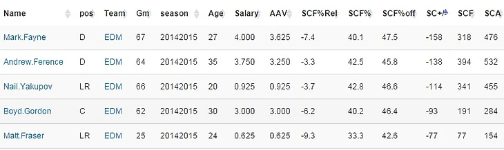 Многое о причинах такого показателя полезности Якупова скажет продвинутая статистика. Вот табличка, показывающая разницу в количестве голевых моментов у ворот «Эдмонтона» и его соперников, когда Наиль находился на площадке в равных составах. При нем в ситуациях 5 на 5 «Ойлерс» создали 341 опасный момент, но при этом позволили другой команде создать 455. У Фэйна и Ференса отрицательный баланс еще хуже, но они защитники, которые играют значительно больше.