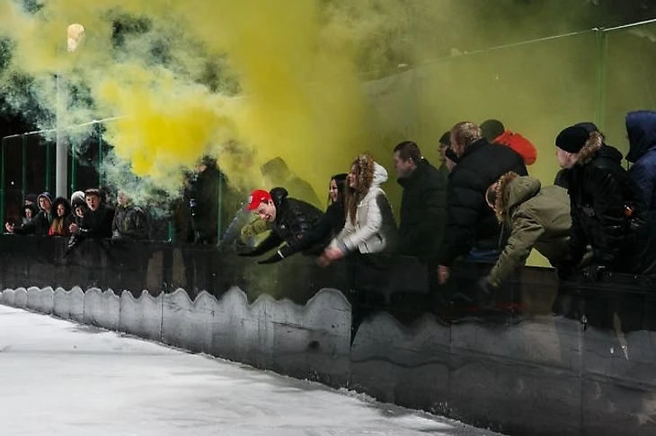 Развешиваются афиши в подъездах, большинство матчей снимаются на видео. Причём не только сами матчи, но и «околохоккей». Вот, например, установка на игру. Здесь также применяют давно напрашивающуюся камеру Go Pro, которая, считаю, могла бы не только помочь всем лигам со зрелищностью, но и, возможно, с послематчевым анализом. Фаны устраивают шоу с пиротехникой и народу, по крайней мере на матчи Соколиной Горы, ходит немало.