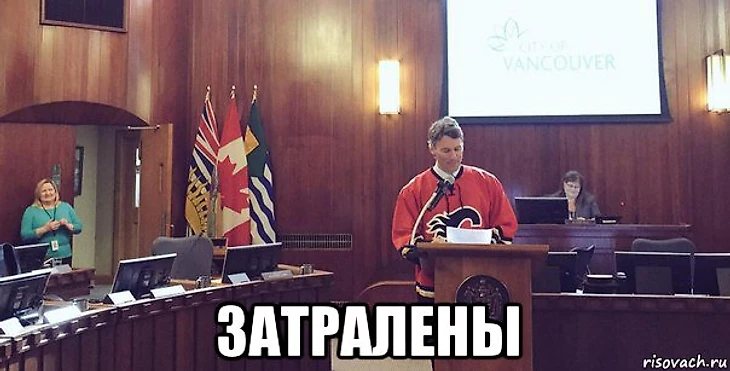 Мэр Ванкувера Грегор Робертсон читает стихотворение, написанное мэром Калгари в городском совете Ванкувера после 6-го матча серии команд из этих городов: