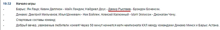 Именно так выглядела стартовая тройка астанинского клуба в заявке на матч с минчанами. Невольно начали закрадываться мысли, что, может, Рыспаев действительно молодой талантливый хоккеист и Назаров его неправильно использовал. Но вбрасывание показало, что все это было лишь уловкой Евгения Корешкова – Рыспаев был удивительно похож на Мартина Сен-Пьера и даже играл в его свитере.